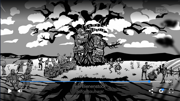 „Mit seiner postapokalyptischen, rurbanen Zukunftsvision, in der die Sorben[6] wieder im Einklang mit der Natur und in einer durch die Generationenfolge stabilisierten Idylle leben, lässt Krabat 3000 zentrale ideologische Tendenzen von Serbska utopija 2 sichtbar werden[7] (vgl. Abb. 7). Imaginiert wird eine in »Völker und Stämme« eingeteilte Welt, in der das sorbische Volk[8] einen festen Platz einnimmt[9], was eine ›Einheit‹ von Raum, Volk und Kultur suggeriert, die keine ethnische und kulturelle Pluralität innerhalb eines Territoriums zulässt.[10] Im Lindenbaum, der als gängiges Symbol für das Sorbische fungiert (vgl. Šatava o.J.), und »wie ein Bienenstock« organisiert ist[11], in dem eine klare Hierarchie und Rollenverteilung herrscht[12], leben die Sorben[13] als eines von vielen voneinander abgegrenzten Völkern (die voneinander lernen, sich aber offenbar nicht vermischen)[14] und haben ihre ökologischen und sozialen Probleme durch die Errichtung rurbaner Strukturen und den intergenerationellen Wissenstransfer gelöst. Der Film wird damit Ausdruck der Sehnsucht nach einer vormodernen Idee des Aufgehobenseins des Individuums in den unverrückbaren Strukturen einer ethnisch, kulturell und territorial homogenen Gesellschaftsorganisation[15], die in dieser Erzählung über eine Rückkehr in die (allerdings mit Science-Fiction-Elementen angereicherte) Ruralität realisiert wird. Die dabei mitschwingende[16] Idee der hierarchisch[17] organisierten und funktionierenden ›Volksgemeinschaft‹, wie sie u.a. auch in völkisch-nationalistischer Literatur des 20. Jahrhunderts mit der Metapher des Bienenstocks versinnbildlicht wurde[18] – der Klassiker Die Biene Maja und ihre Abenteuer (1912) von Waldemar Bonsels lässt sich hier als Beispiel anführen (vgl. Wrobel 2010: 17–32)[19] –, zeigt die Anschlussfähigkeit der im Film präsentierten Narrative an neurechte Ideologien wie den Ethnopluralismus (vgl. Eckert 2010: 27) oder den oben erwähnten Ethnofuturismus in seiner neurechten Auslegung.“
